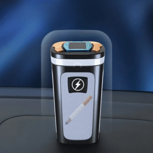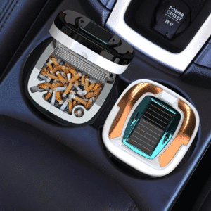 This is a multifunctional car ashtray with built-in solar-powered LED light and electronic lighter. It lights up automatically under sunlight / with cover open, resists heat thanks to ceramic or stainless steel inner cup, and helps neutralize smoke odours