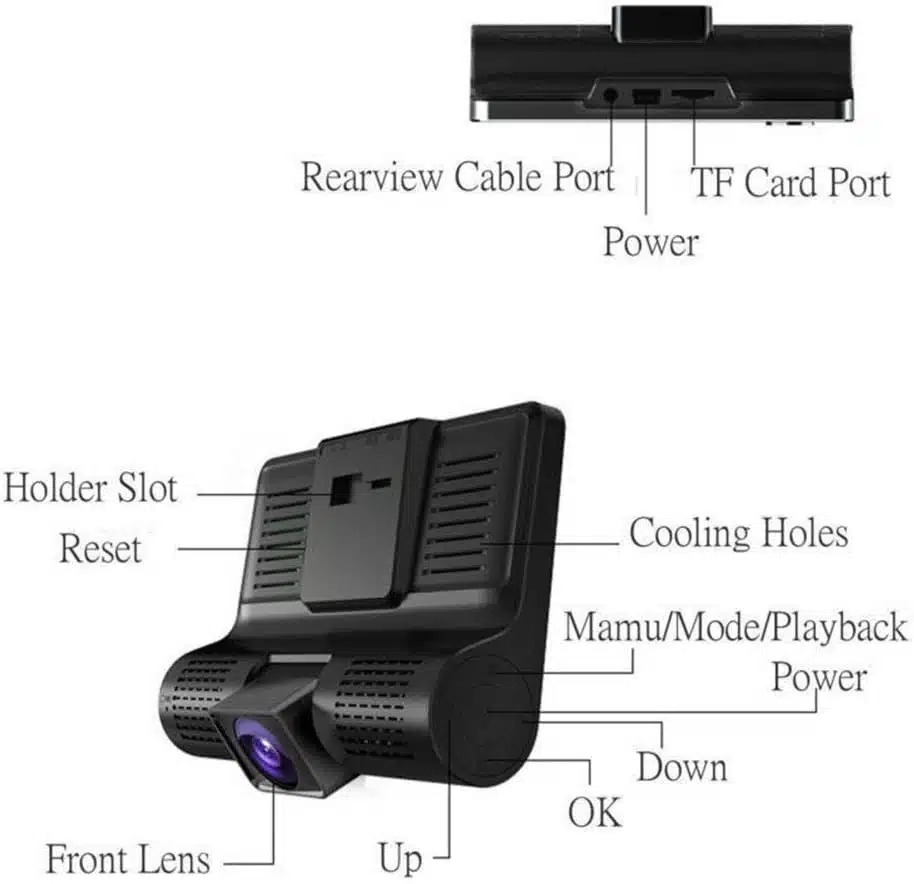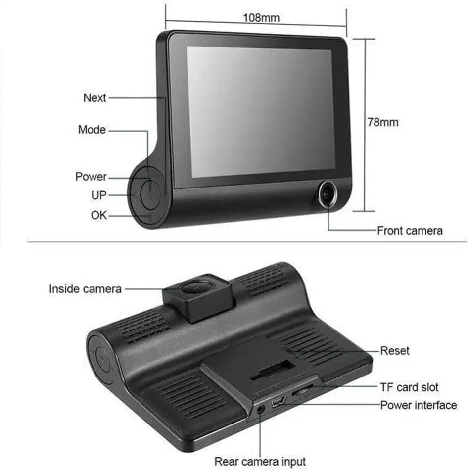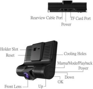 - Features: Loop recording; G-sensor (records automatically when impact detected); parking monitor; night vision / WDR; rear view camera input (if applicable)