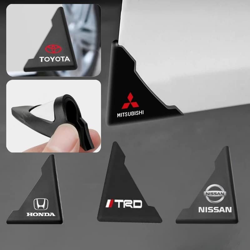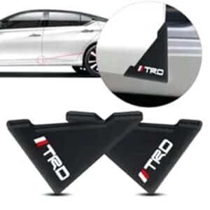 A pair of black silicone corner guards made to protect car door edges. These small guards cushion impacts when the door opens or when hitting other objects, helping prevent paint damage and scratches. Comes as 2 pieces sized to cover corner edges, specifically shaped for certain car models (Honda, Mitsubishi, Nissan, Toyota, TRD)