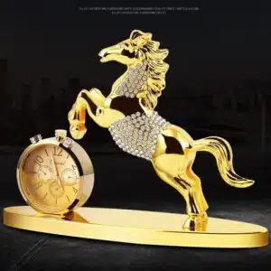 decorative golden-colored horse figurine that includes a small clock, designed as a tabletop or car dashboard showpiece. It’s made from resin and intended to bring an elegant aesthetic plus a touch of Feng Shui symbolism (luck, success) to interiors or vehicle dashboards.