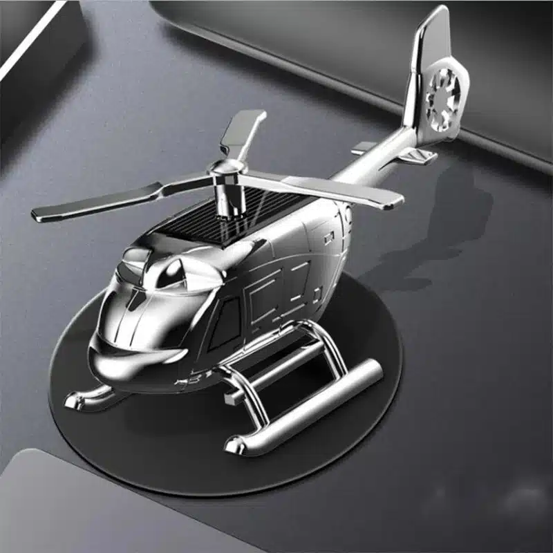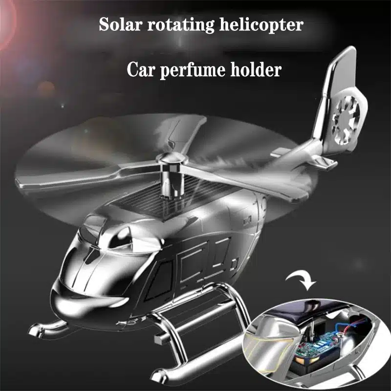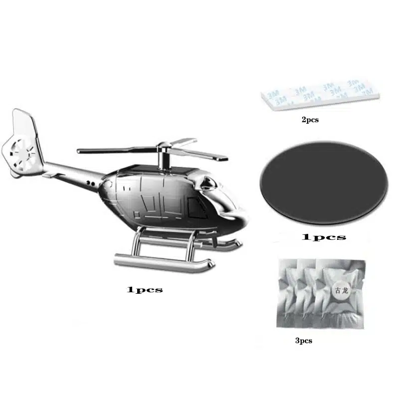 A decorative solar-powered car perfume diffuser shaped like a helicopter. Its rotor blades spin when exposed to sunlight, helping diffuse aroma in your vehicle using aroma tablets.