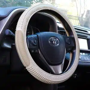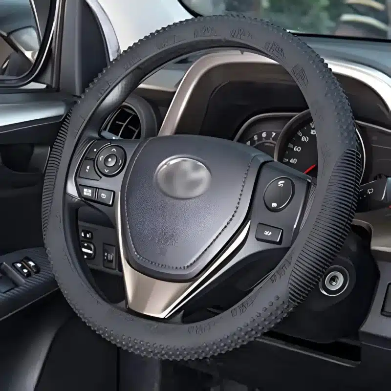 A durable silicone steering wheel cover designed to fit most cars (“universal fit”). It’s soft to touch, provides better grip, and comes in at least two color options (Black, Beige). Easy to install and helps protect the steering wheel from wear, heat & slipping.
